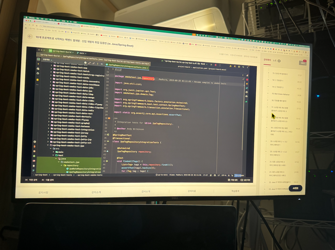자바 입문 책 여러권을 통달해도 다시 if 문과 for 문이고, Hello, World를 수 백 번도 더 찍어 보았으며, 스프링으로 개발을 한다고 하여 웹 사이트를 브라우저에 띄워 본 경험이 있는 분에게 적당하다. 실전에서 날고 긴다는 많은 선배 개발자들이 모여 필요한 기술과 기능, 기본기와 실무 내용을 모니터 너머에서 가르쳐 준다고 생각한다면, 100 시간 과외를 받는데 이 강의 하나로 가능하다면 도전하지 않을 이유가 없다.