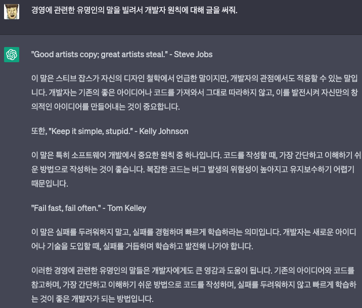 기계 따위가 코드를 작성하면서 벌써 ‘Make it, Works.’ 단계에 이르렀다. 기계가 ‘Make it, Better.’ 단계에 이르기 전에 개발자는 그것이 글이든 코드든 많이 읽고 많이 쓰고 더 좋은 코드를 만들기 위해 다양한 시도와 노력을 아끼지 않았으면 한다.