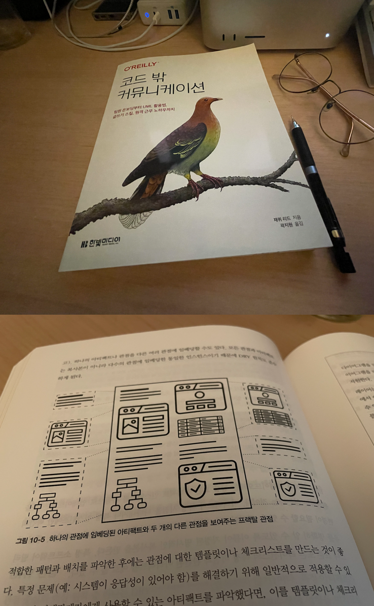 이 책은 예상과는 달리 더 넓은 범위를 대상으로 한다. 개발자의 소통법을 기대하였지만, 개발자와 더불어 다른 분야의 엔지니어나, 아키텍트 관련자, 디자이너, 기획, 데이터 엔지니어 등 우리가 만나야 할 모든 기술과 관련된 이들과 소통하는 방법에 대해 설명한다. 개발자 혹은 본인이 상대하는 상대에 따라 커뮤니케이션을 어떤 방식으로 해야 하는지를 언어를 넘어 도식화 (그래픽, 도표, 다이어그램) 하여 진행하는 방법, 그 대화를 위한 표현의 일관성과 추상화 레벨을 예시를 들어 자세히 설명한다. 많은 책을 리뷰하면서 종종 지인들에게 책을 추천했지만, 이번 책은 한 챕터를 읽을 때마다, 소통에서 답답했던 부분이 쉽게 해결될 수 있다는 점을 지인들에게 책에서 소개한 다이어그램을 보내며 놀라움을 표현했던 적이 있던가 싶다.